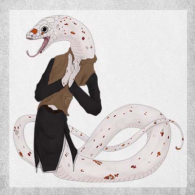 This skin still sheds and gives them a form of protection, but it's not nearly as good at preventing damage as scales would be. Their bodies are also considerably softer and squishier, their colors are more vibrant than other Serpentes and their eyes appear larger due to the lack of scales around them. Because of these traits many Animalian consider scaleless Serpentes to look kinder and easier to approach, but they can be just as rude and nasty as any other Serpentes. The scaleless trait is extremely rare to come across with many Animalian spending most of their lives not even knowing it exists.